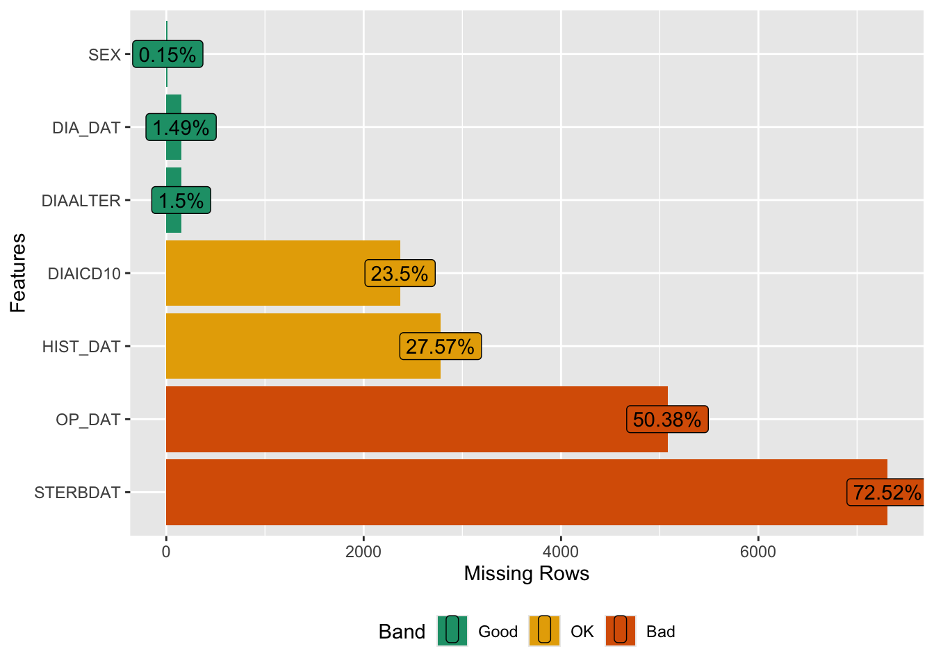 Nachfolgend nochmals unsere Auswertung zu fehlenden Werten, diesmal aber in einer druckreifen Grafik-Version, die dank der zugrunde liegenden Farb-Palette sogar für Menschen mit Farbsehstörung geeignet wäre. Parallel zur (im HTML-basierenden Format) angezeigten Grafik könnte über einen Einzeiler dieselbe Grafik auch zur weiteren Verwendung in verschiedenen Formaten wie PDF, JPEG, TIFF, PNG, BMP, SVG oder PDF abgespeichert werden - wie gesagt, druckfertig und in gewünschter Auflösung und Größe.