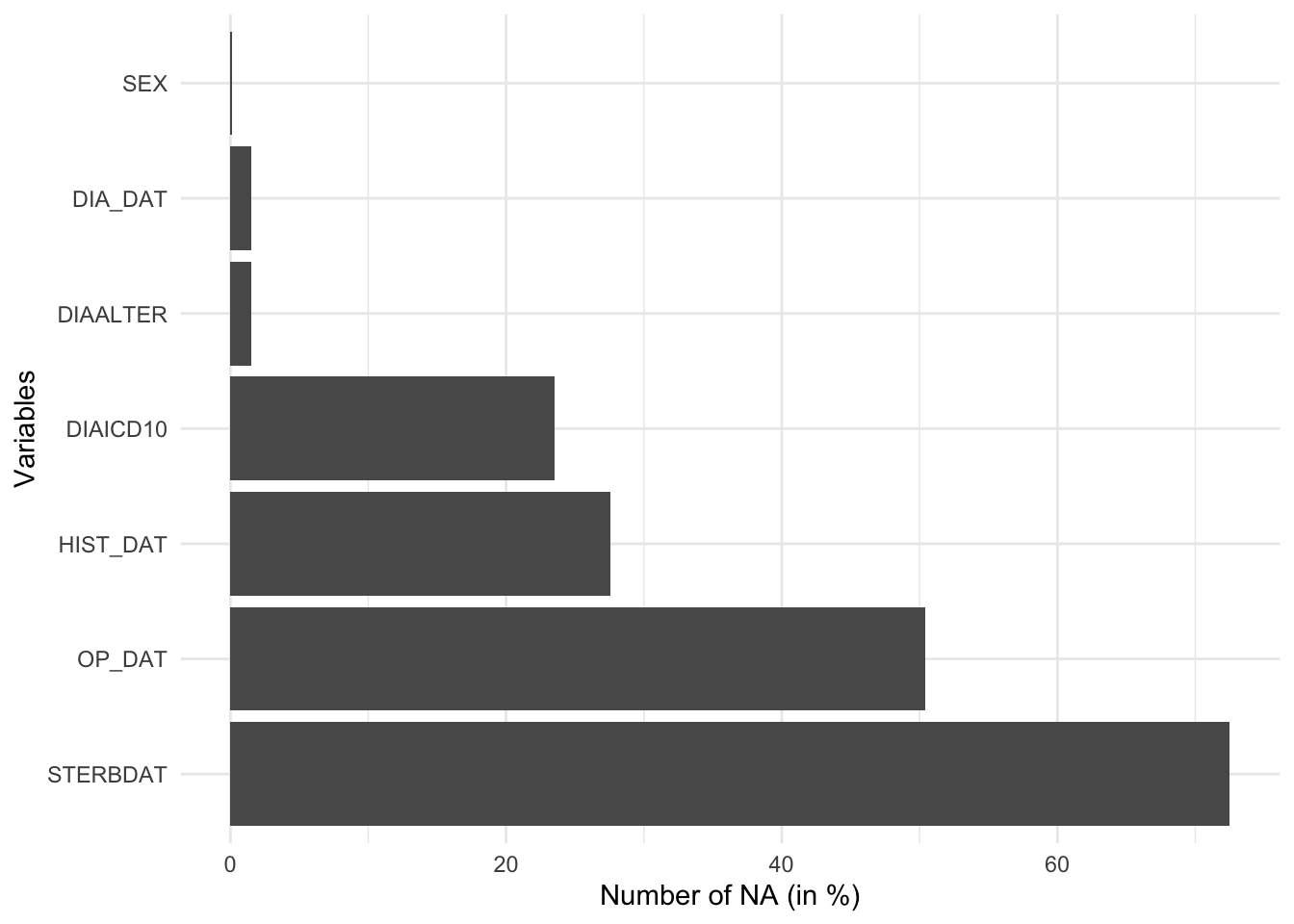 Man kann sehen, dass bei der Dateneingabe das Patientengeschlecht (SEX) praktisch immer vorlag, und sowohl das Diagnosedatum (DIA_DAT) als auch Alter des Patienten bei Diagnosestellung (DIAALTER) nur ganz selten fehlt. Im Kontrast dazu steht das Sterbedatum, das bei den meisten Fällen fehlt. Dies ist natürlich sehr verständlich, weil die Überlebensrate nach Krebs heutzutage sehr hoch ist, und deshalb bei den meisten Fällen ein Sterbedatum nicht angegeben werden kann.