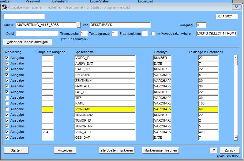 Im Auswertungslauf wird eine Tabelle wie die nachfolgende generiert. Die patientenbezogenen Daten wurden hier ausgegraut.