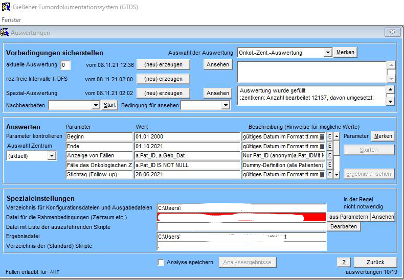 Hier kann auch die Auswahl der Fälle (in der Abbildung für das onkologische Zentrum) vorgegeben werden. Wichtig ist es, den Speicherort der “Ergebnisdatei” korrekt festzulegen. Die Vorgabe des “Laufwerk C:” ist in der Regel bei einer Netzwerk-basierten Server-Client-Situation unzutreffend.