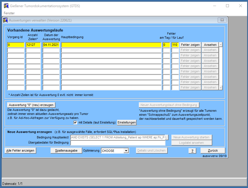 Zur Kontrolle können für den erzeugten Auswertungslauf die Anzahl der erzeugten Tumoren (Zeilenzahl der Tabelle), das Datum des letzten Auswertungslaufs und die Anzahl noch zu korrigierender Fehler abgelesen werden.